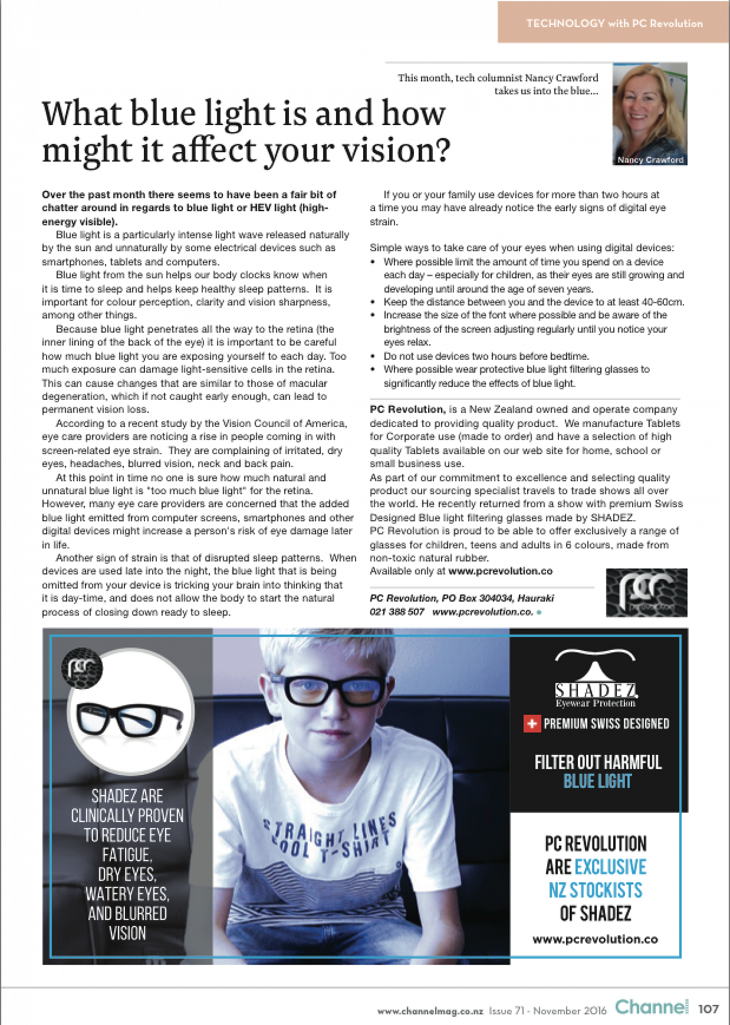 Attached is a copy of the latest Channel Magazine with an article all about the effects of blue light and a copy of an advertisement.