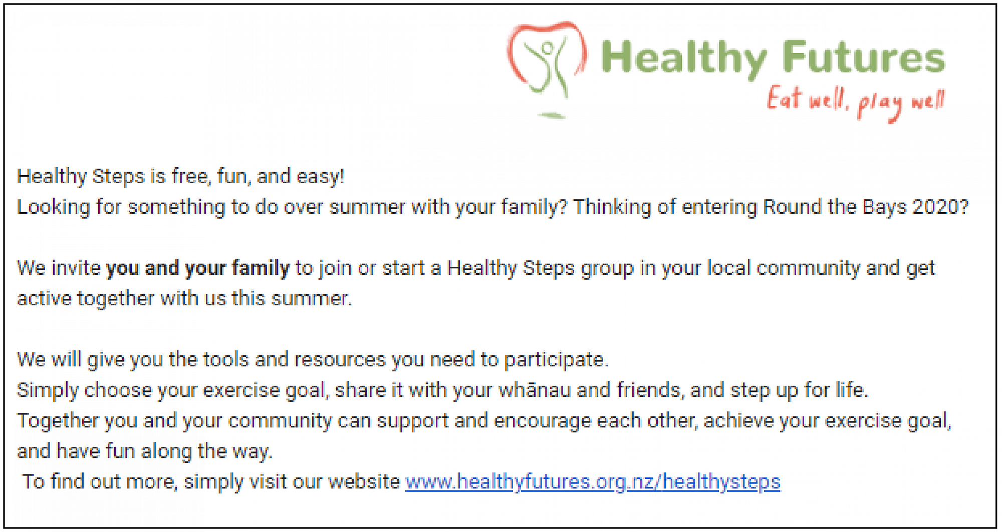 Our goal is that families within your school community will be motivated to participate in the Healthy Steps movement. Starting or joining an existing group is easy. Simply follow the link on our website: www.healthyfutures.org.nz/healthy-steps