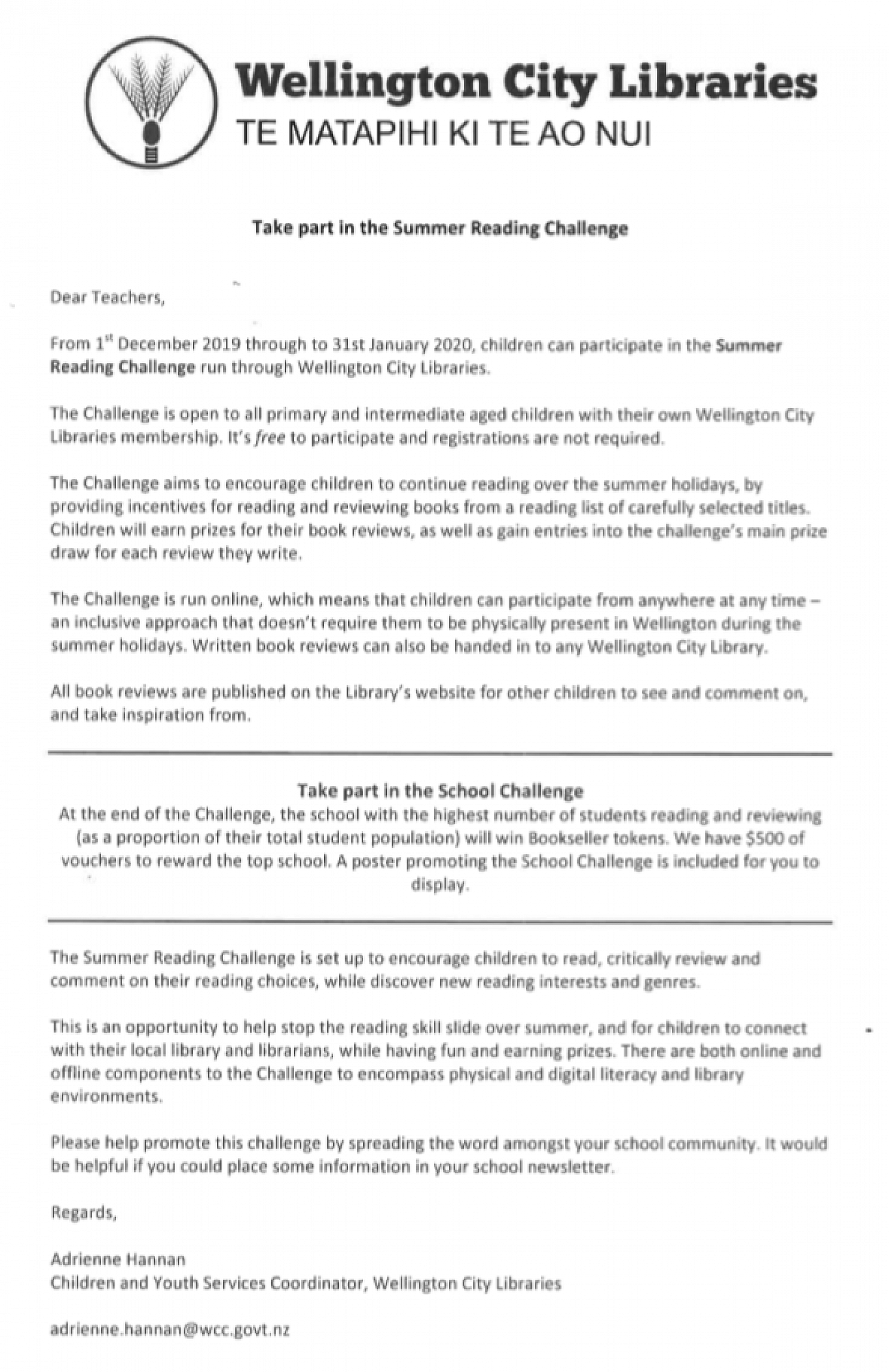 Wellington City Libraries are running a Summer Reading Challenge which, additionally, can win you and the school prizes.