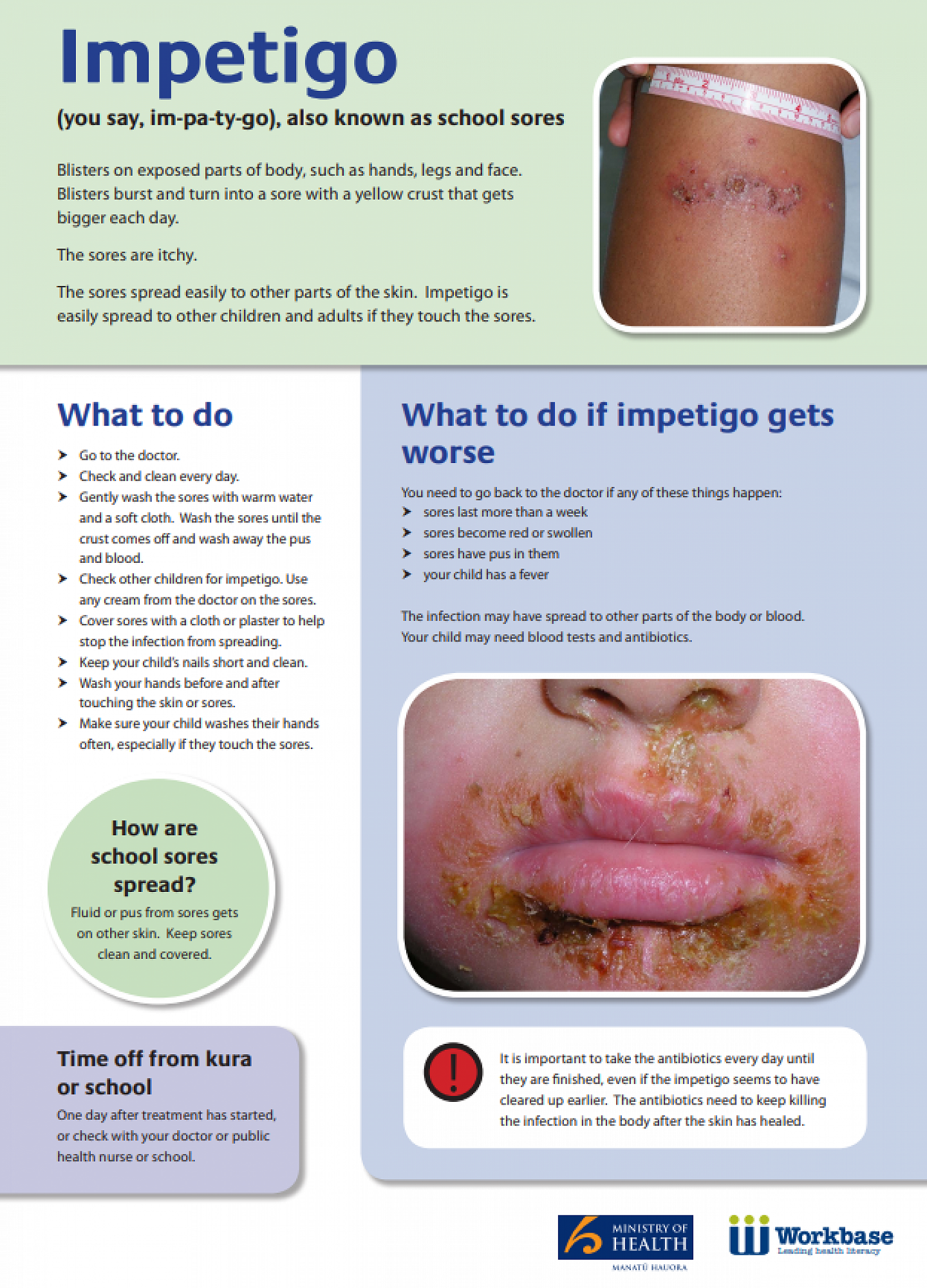 Impetigo (said, im-pa-ty-go), also known as school sores, is a common skin infection caused by bacteria. The infection causes blisters on exposed parts of body, such as hands and face, especially around the nose and mouth. The blisters burst and turn into a sore with a yellow crust.