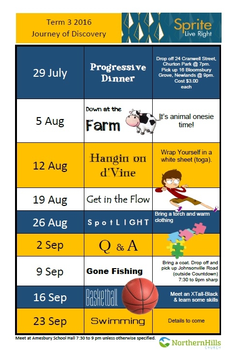 Check out the programme for Term 3 above, and get your friends together because Sprite is open to anyone in the community in years 7 to 10. (Mum and Dad: just note that some weeks, the sessions are run from different locations for a bit of variety.)