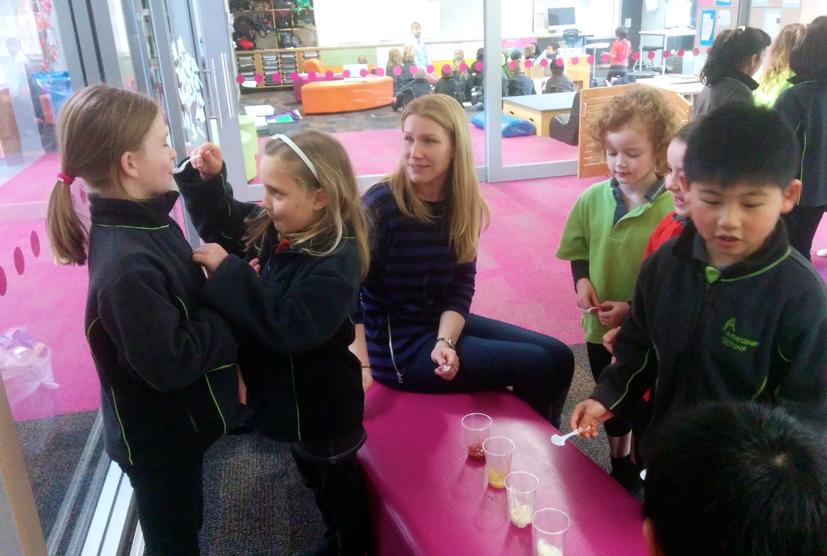We tried to eat food and identify what we were eating without looking at the food - this is called a blind taste test. Kaitlin's mum, Miranda, came to join in with the fun! It was a lot trickier than we thought to pick the flavour when we hadn't seen what we were trying.
