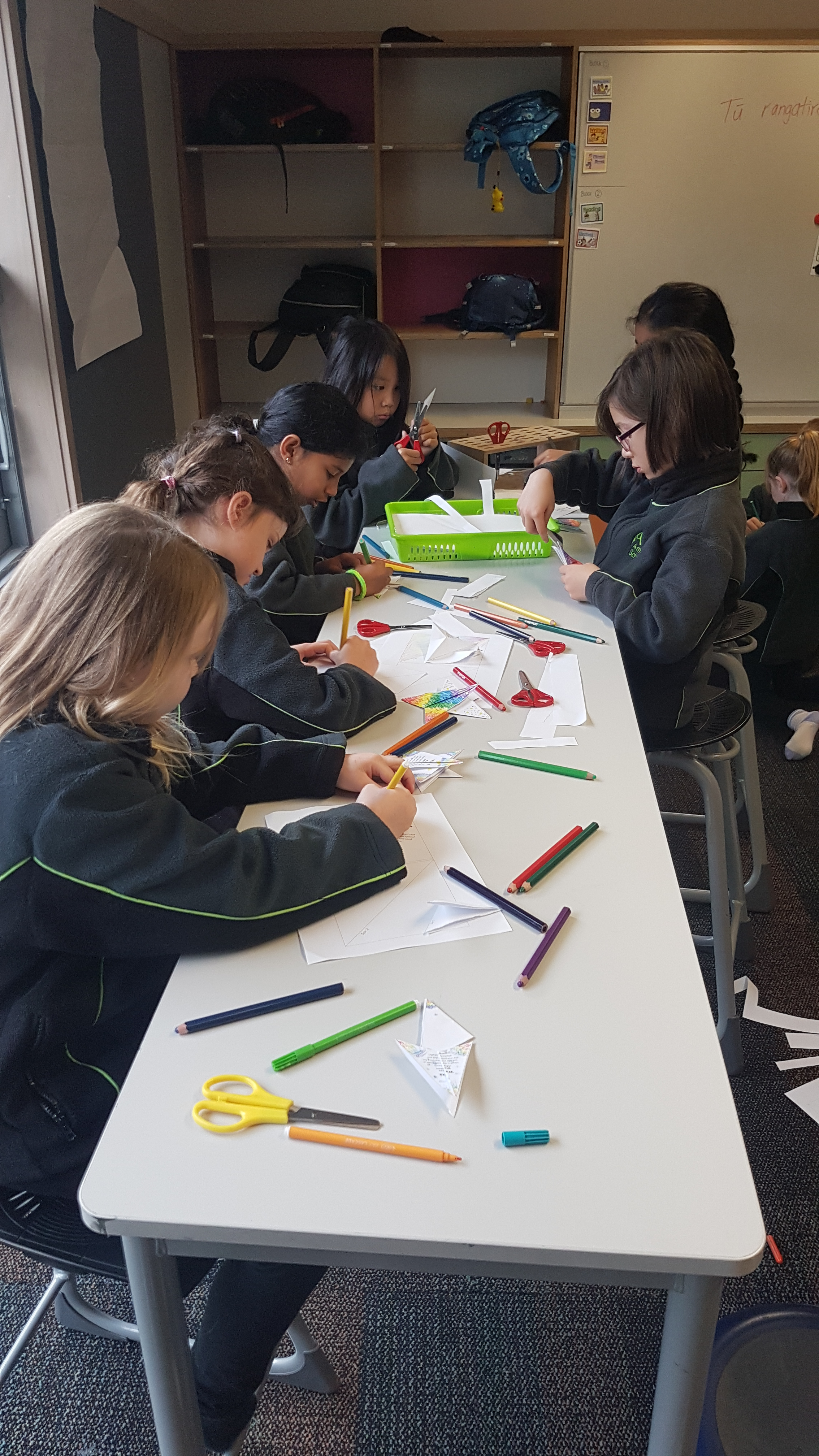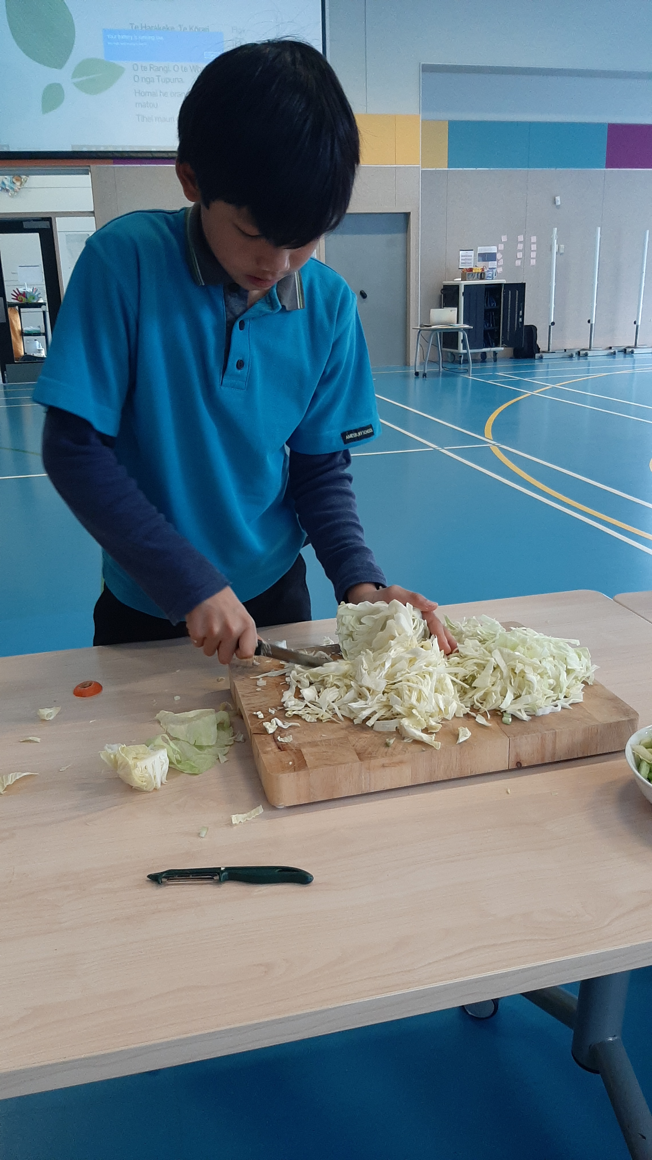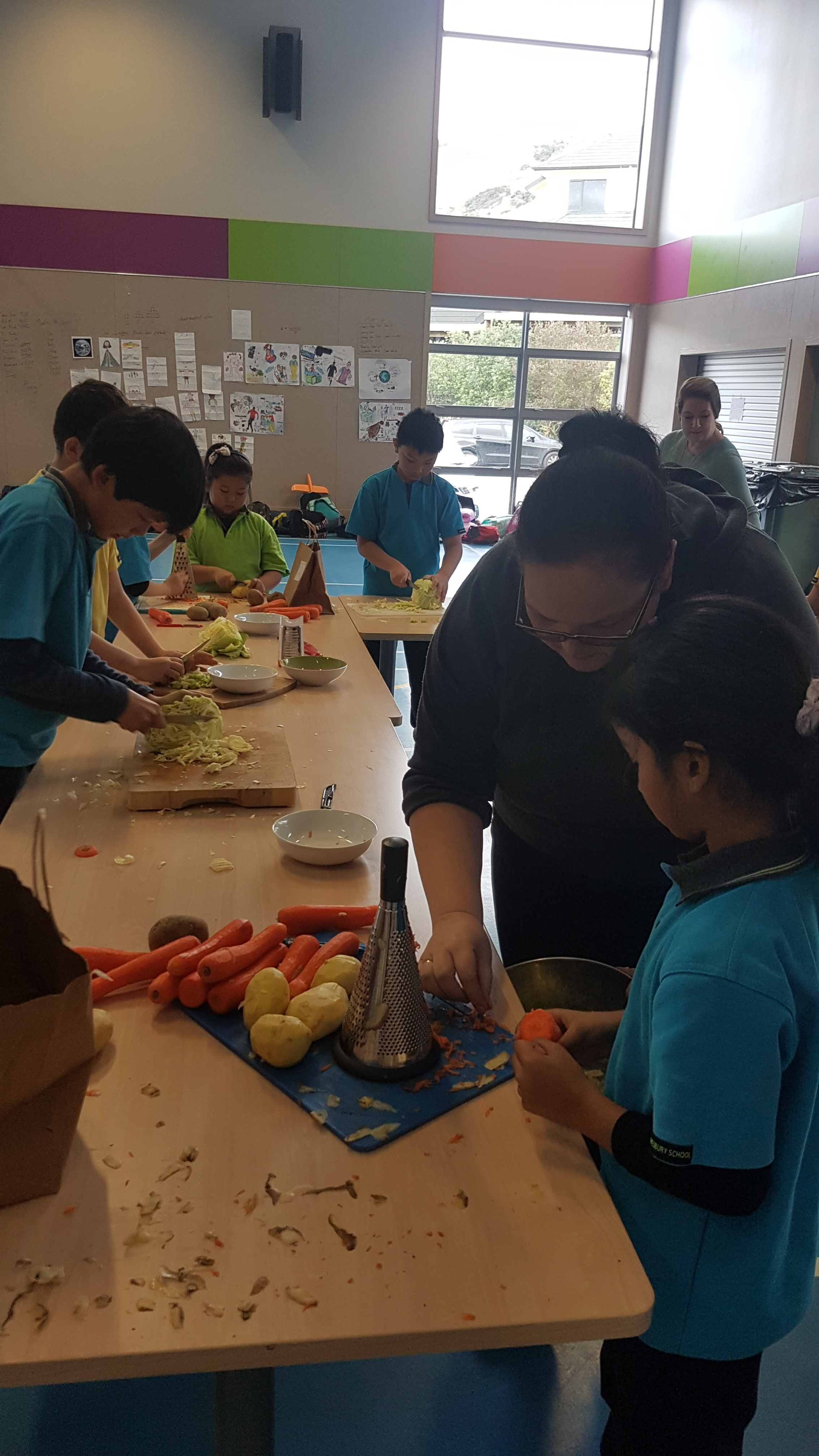 There were activities from making stars and manu tukutuku (kites used to signal Matariki), to creating korowai (cloaks), trying raranga (weaving with harakeke) and making kowhaiwhai art. One larger group of students made soup for the whole school to share at lunch time, accompanied by bread rolls. Much grating, peeling and chopping ensued, with Jasper emerging as a food preparation expert!