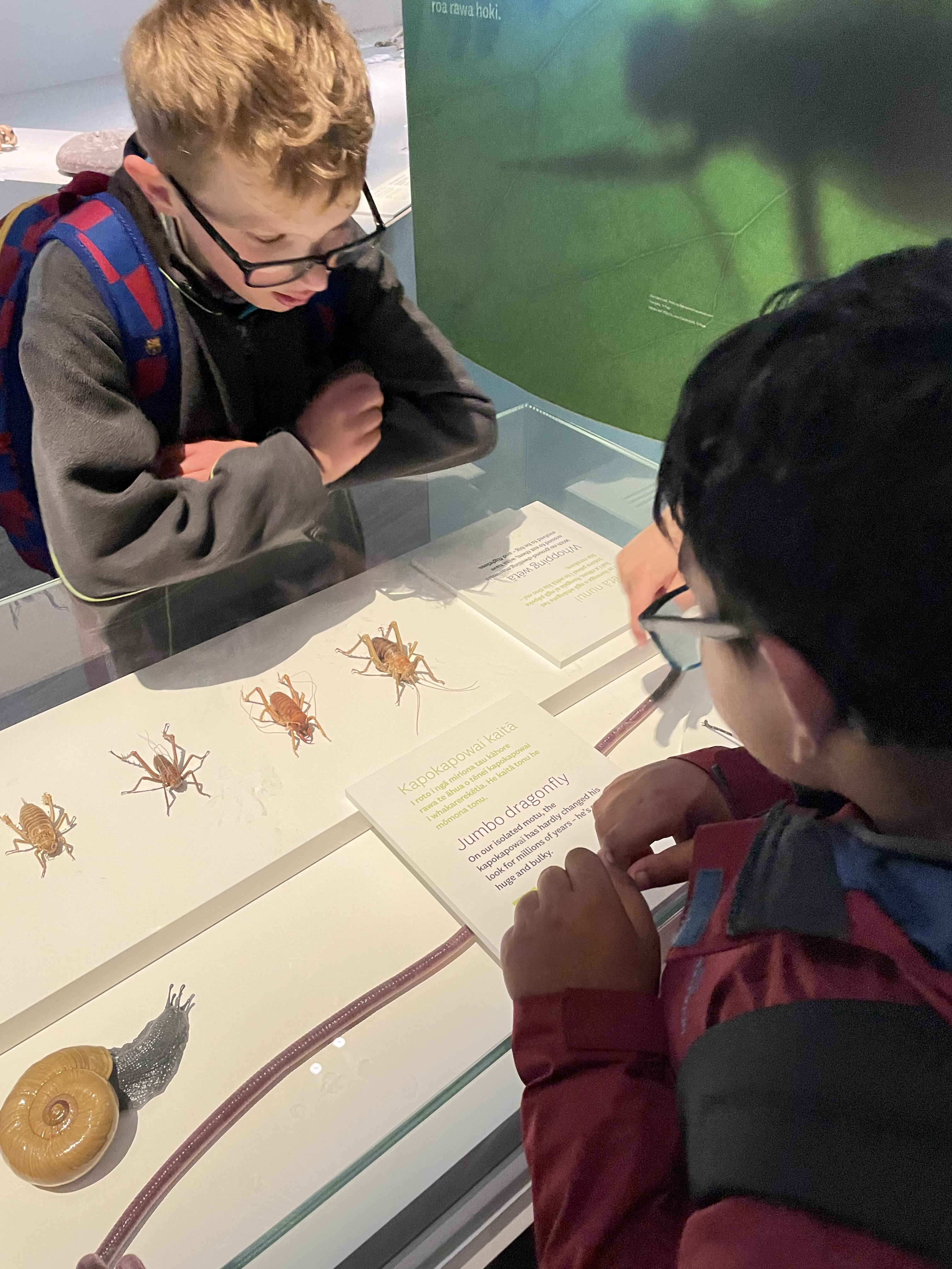 We went on a trip to Te Papa and the City Gallery last term. We went on the bus to go there. At Te Papa, we dug up dinosaur bones and we saw glow worms. We heard birds and they sounded like a beautiful song. There was a bridge at Te Papa and it was very wobbly. We went to Waitangi Park and ate our lunch.