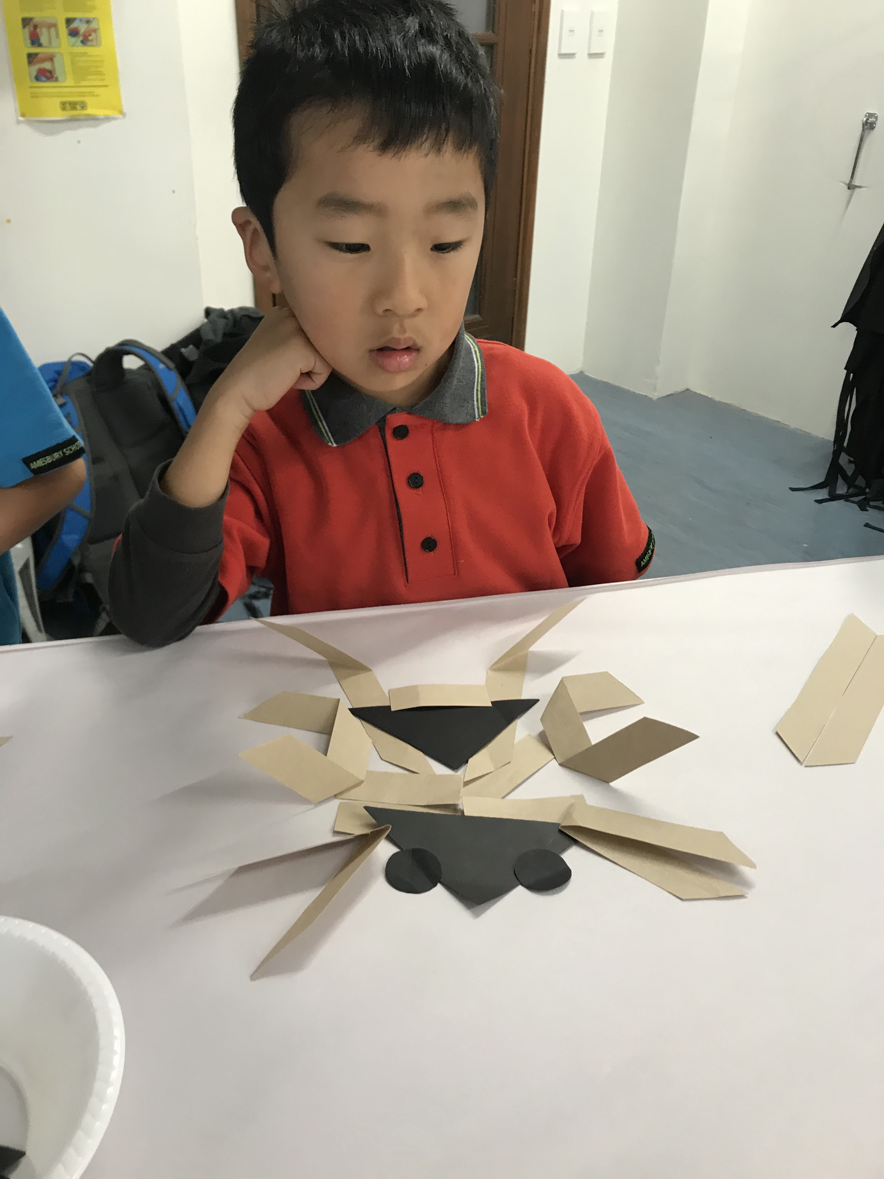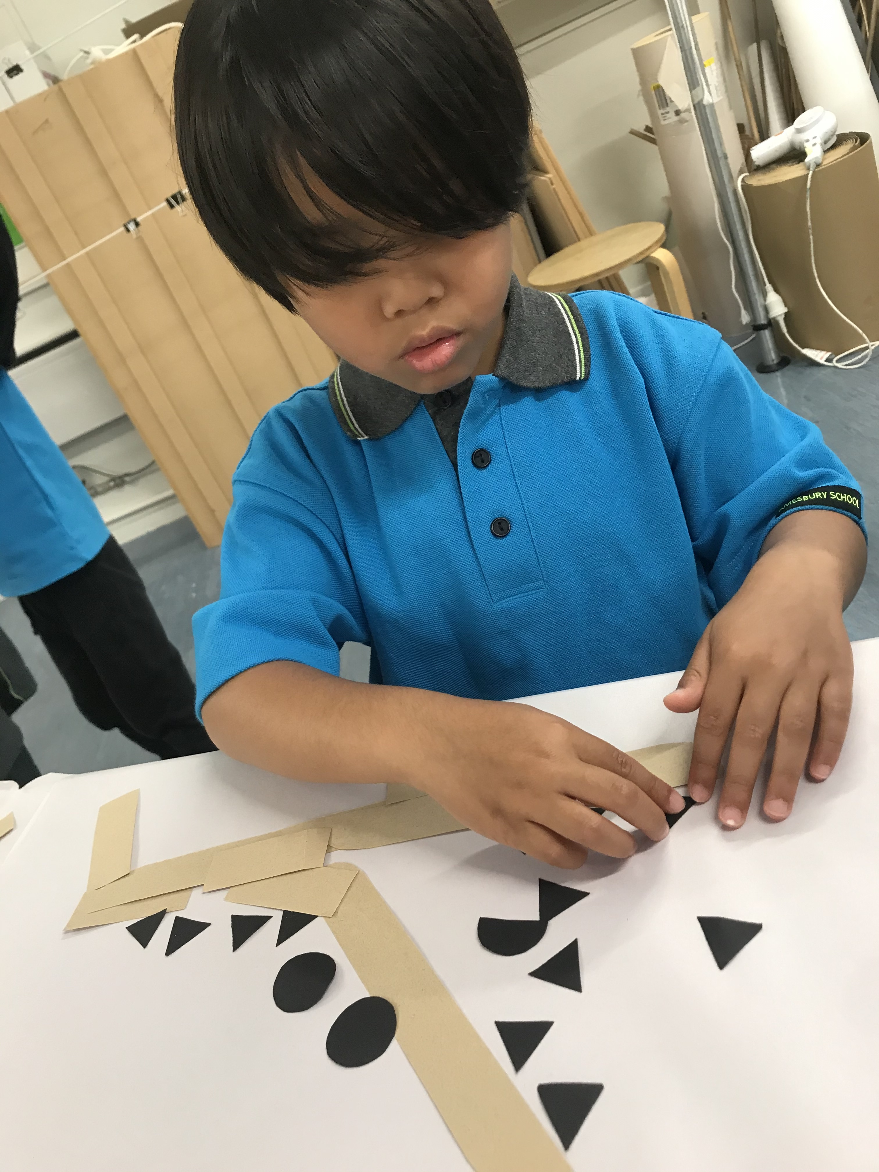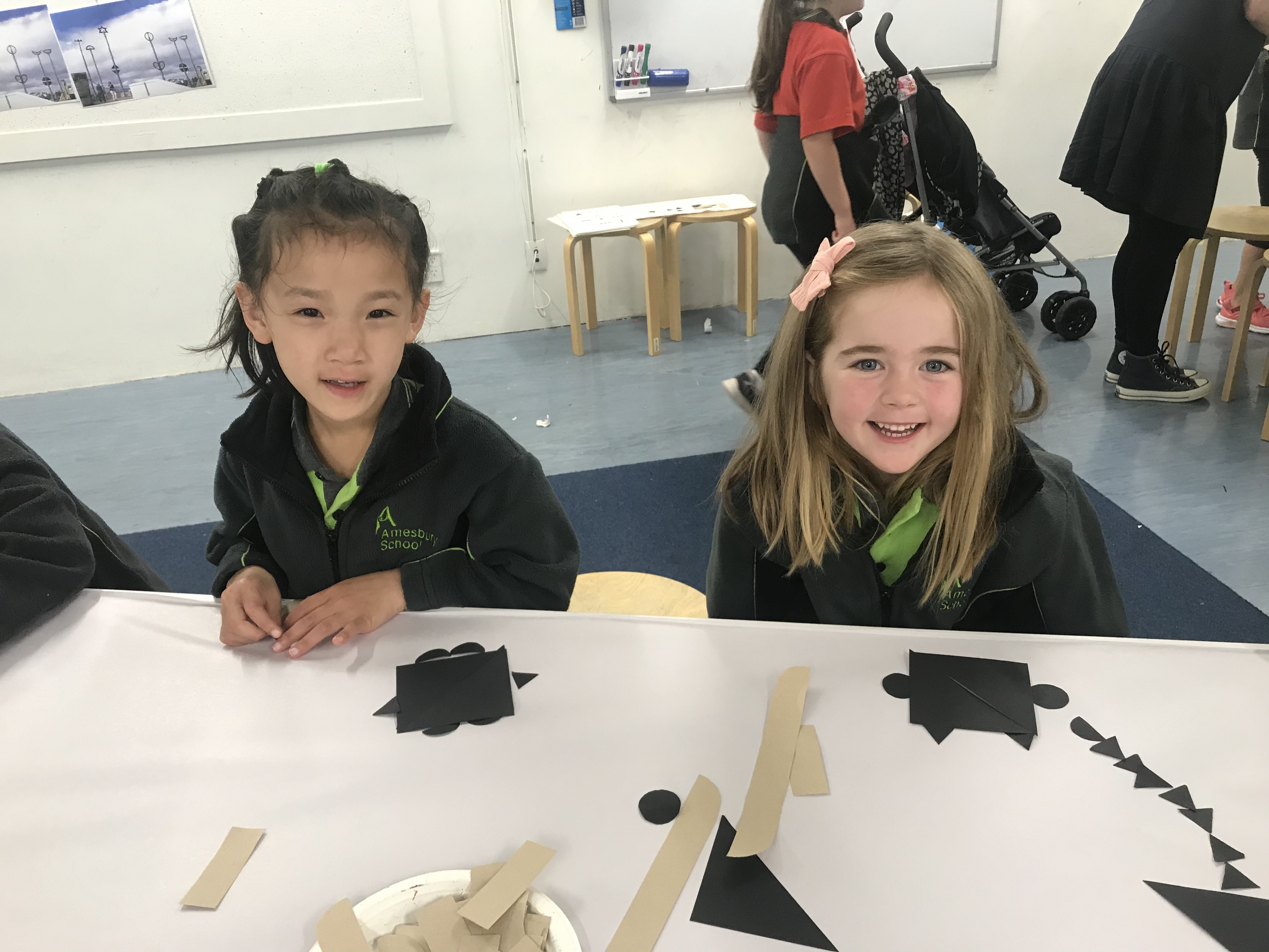 At City Gallery, we were told a story about the two taniwha of Wellington Harbour. We looked outside where we had a shape hunt, and there was a big hand and a big circle in the air. We found shapes outside and we hunted for shapes outside in the sculptures. Back inside the gallery, we made some patterns and animals out of shapes. At the end of the day we went on the bus to go back to school.