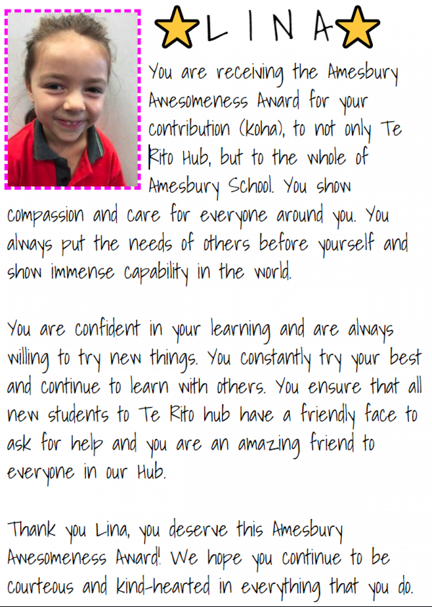 Our Te Rito recipient was Lina
