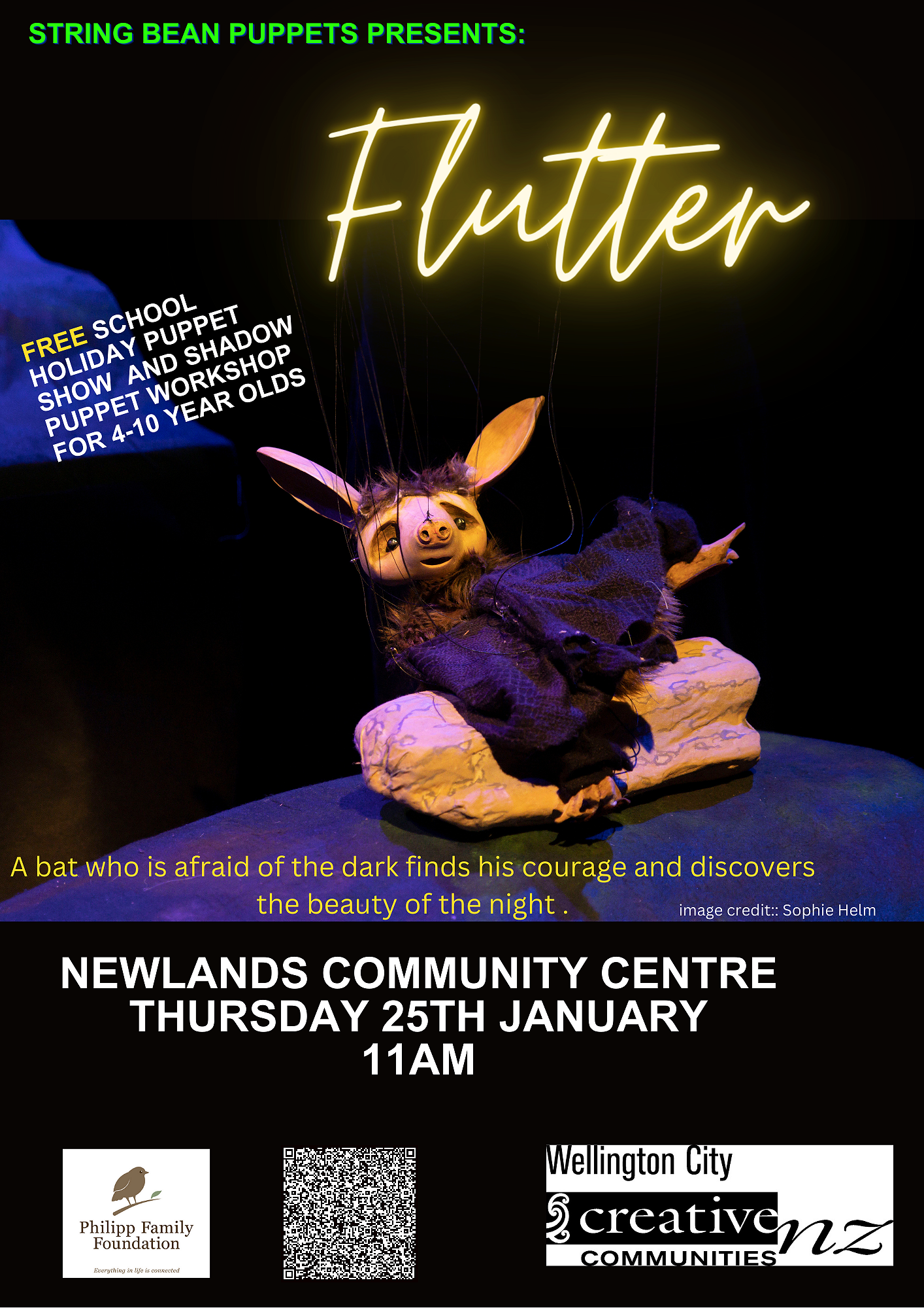 "Flutter" Is a story about a bat who is afraid of the dark, friendship and bravery. It is also about the threats to our native species from introduced predators.