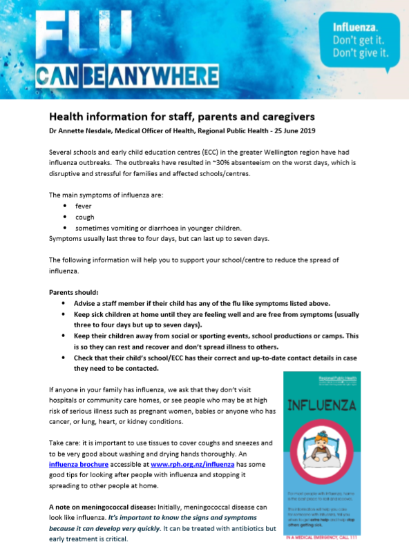 We have had a notification from the Regional Medical Officer of Health regarding influenza in Wellington.