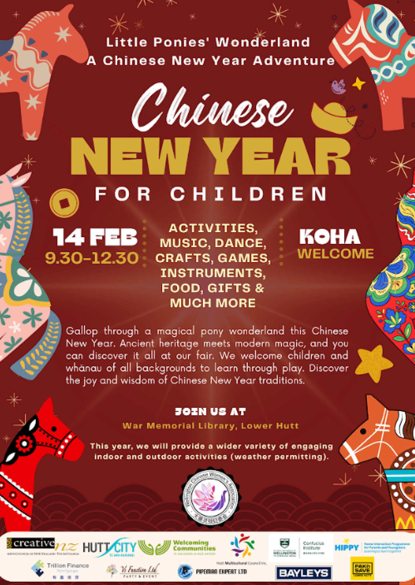 The event is called Year of the Horse Children’s Chinese New Year Fair, taking place on Saturday, 14 February, from 9:30am to 12:30pm at Hutt War Memorial Library. It is a family-friendly event designed for children of different ages, combining fun activities with cultural learning. The programme includes: