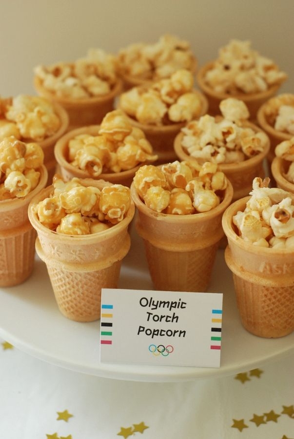 * Olympic torches (ice-cream cup cone with pretzels or popcorn)