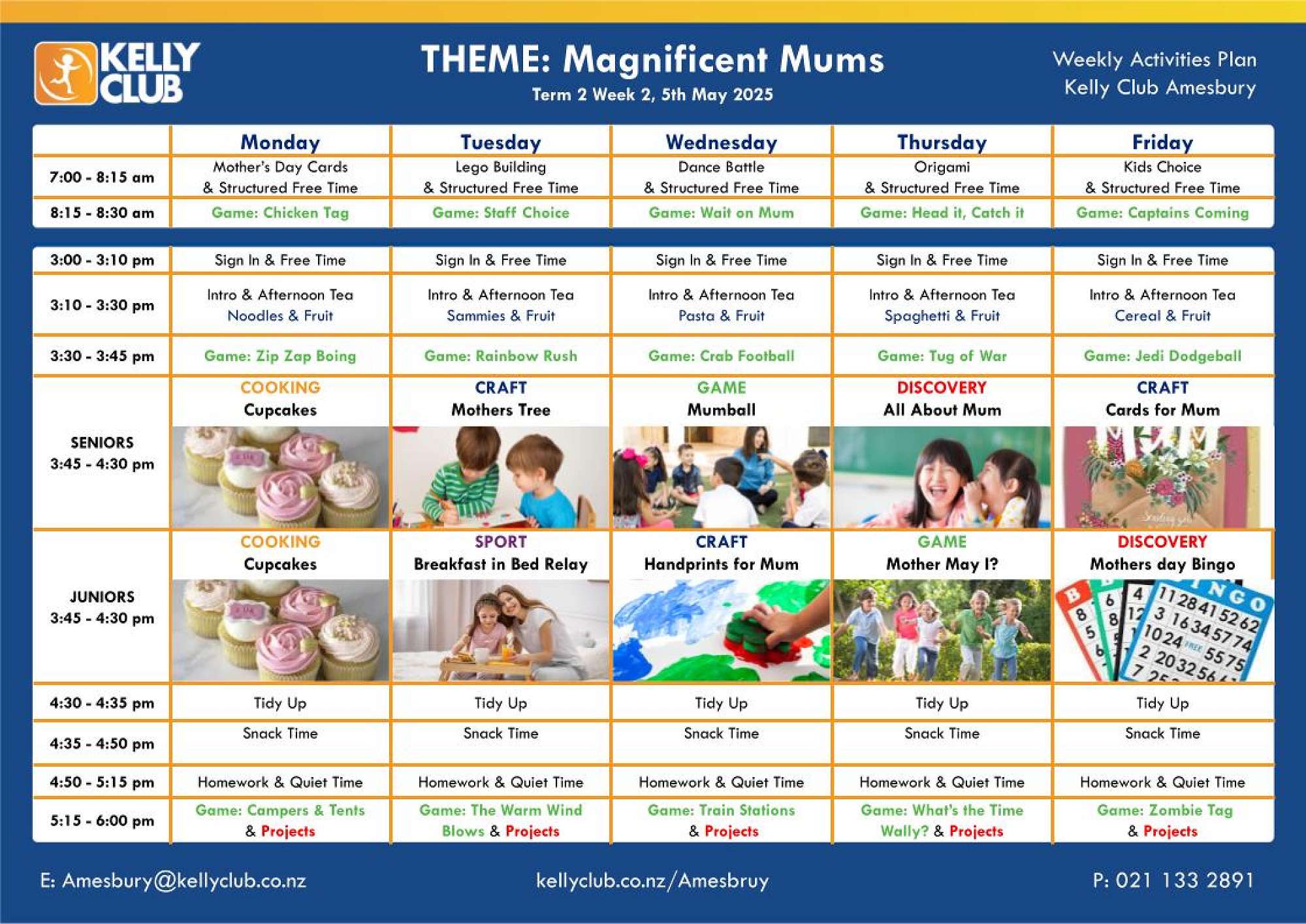 This coming week's theme is Magnificent Mums. We will be baking some delicious cupcakes. We will be creating some fun cards, we will be doing some hand print art work, playing a fun game of bingo with a mothers day twist. We will participating in a breakfast in bed relay. We are so excited to see you there!