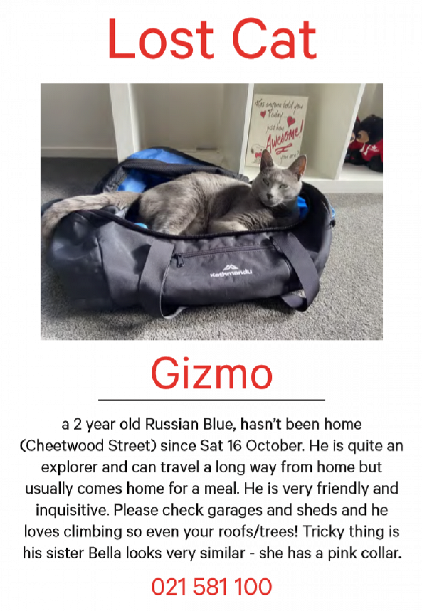 LJ and Ana's cat Gizmo has gone missing. He is a cat that ventures far and has been seen at Amesbury school on occasion.