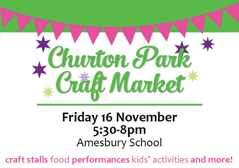 CHURTON PARK CRAFT MARKET Friday 16 November 5.30pm-8pm at AMESBURY SCHOOL – start your Christmas shopping with quality locally produced gifts for sale, entertainment, Sri Lankan food, sausage sizzle, cake stall, KIDS market plus more. Bring the whole family to this free event.