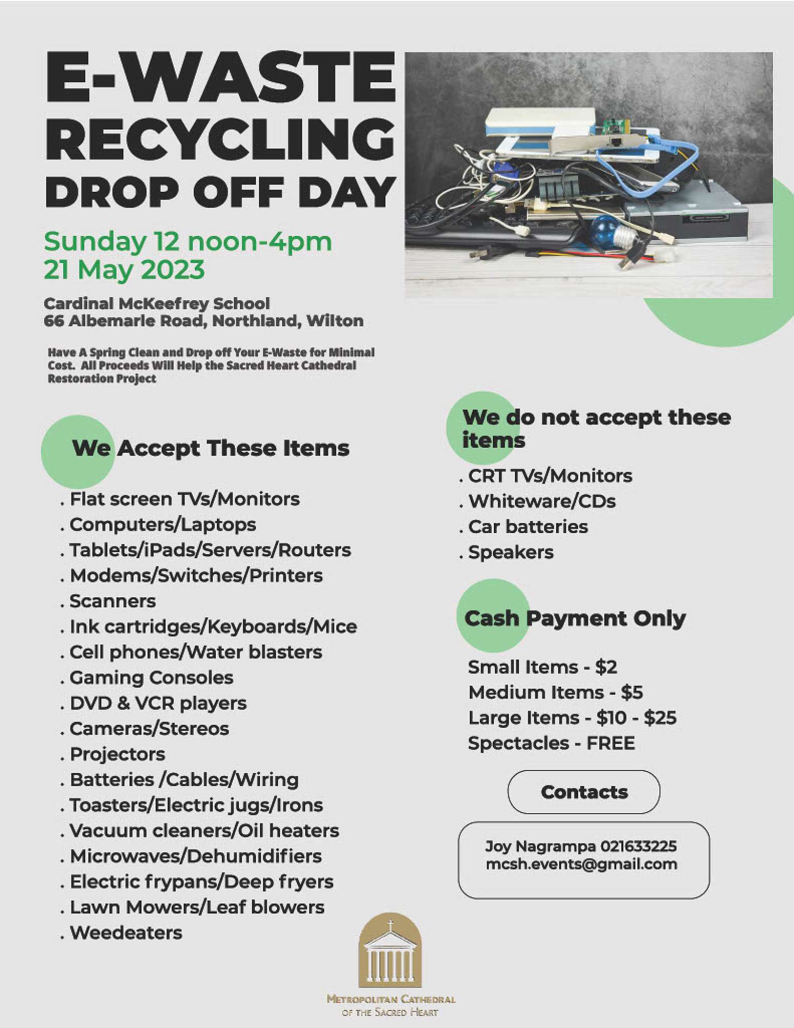 Have a big “spring” clean and drop off your e-waste for a minimal cost. Please also tell your friends. This is a great opportunity to responsibly dispose of your e-waste whilst supporting a very worthwhile cause - The Refurbishment of the Sacred Heart Cathedral.