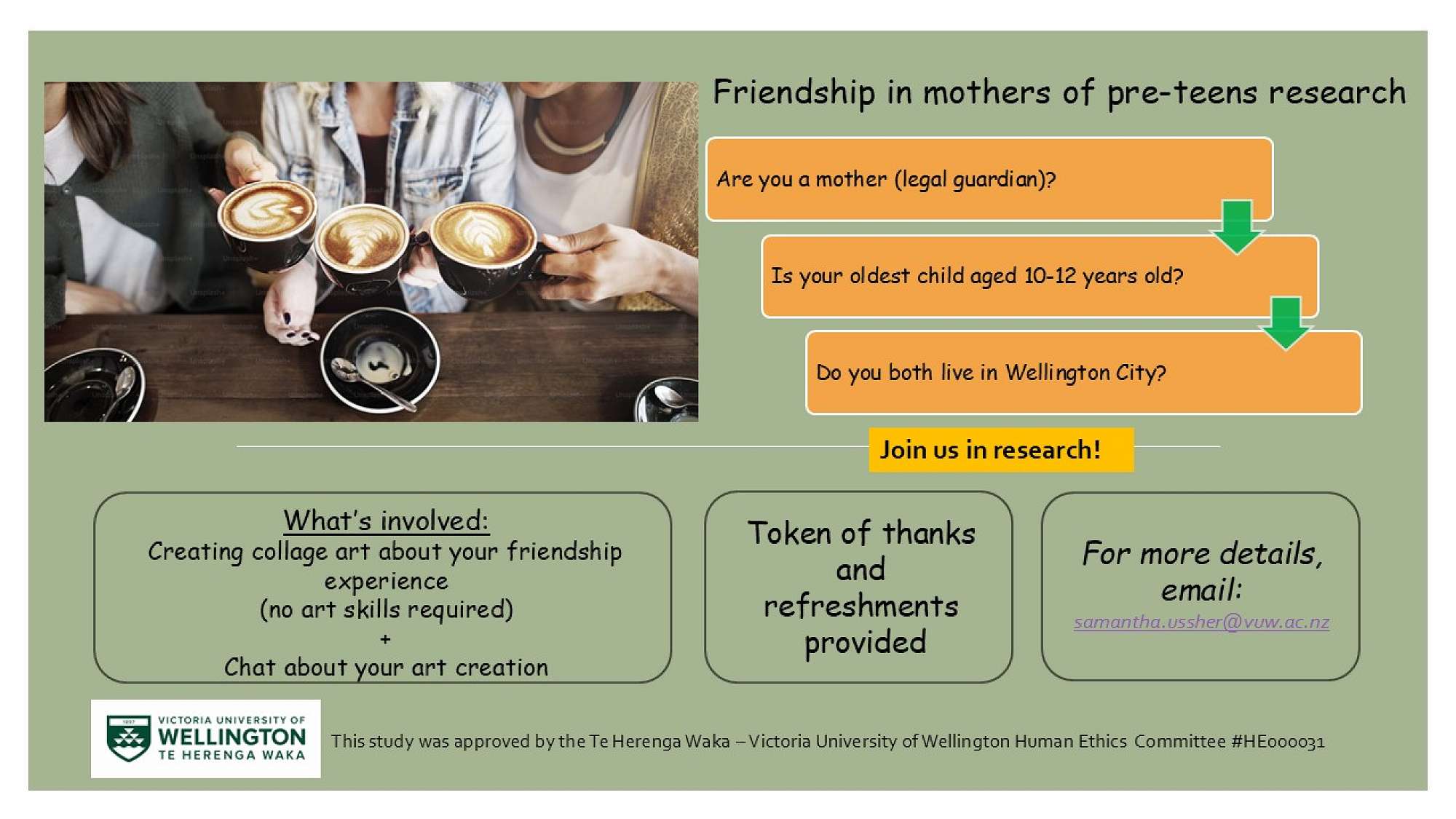 Samantha Ussher is a PhD student at Te Herenga Waka - Victoria University of Wellington. She is conducting research on friendships of mothers (legal guardians) in Wellington City-based families. This study focuses specifically on families where the eldest child is between 10 and 12 years old.