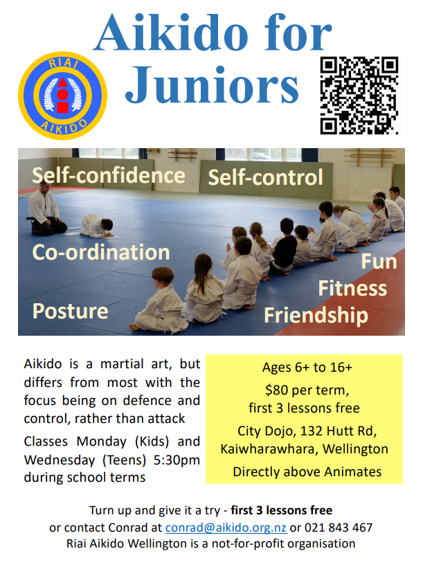 Turn up and give it a try - first 3 lessons are free. And parents, we have beginner classes at 6:30pm for you too :-). Contact Conrad at conrad@aikido.org.nz or 021 843 467, or visit www.aikido.org.nz.