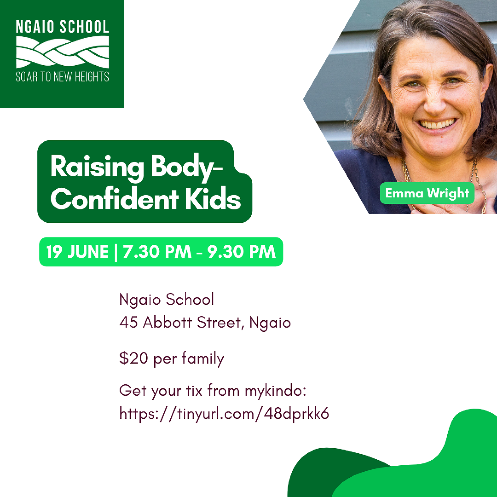 Raising Body Confident KidsNgaio School are hosting a Raising Body Confident Kids parent talk with Emma Wright for our community on Wednesday 19 June 2024.You may have heard Emma interviewed by Jesse Mulligan on RNZ or seen her in The Herald, talking about her recently published book Body Confident: a Guide to Raising Happy Eaters. She holds a Master's Degree, is well researched and has lived experience with disordered eating. Emma's talk will arm you with practical tools and strategies to help your child build resilience to damaging messages, eat without overthinking and have a healthy relationship with their body.