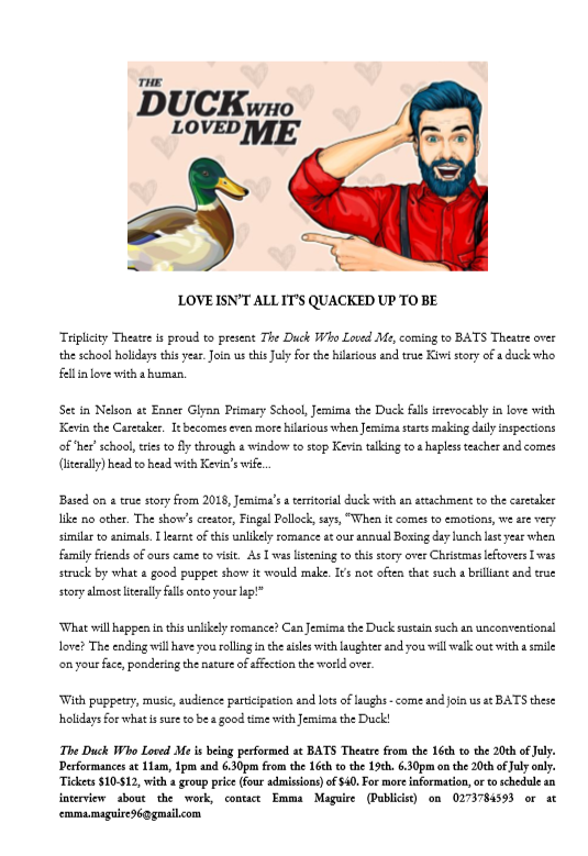 Triplicity Theatre, are performing their show The Duck Who Loved Me at BATS Theatre in Wellington from the 16-20 July.