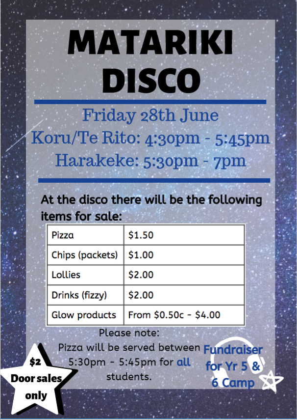The Matariki Disco is on on Friday. Please complete the form by Monday and below is the flier with prices included.