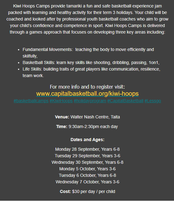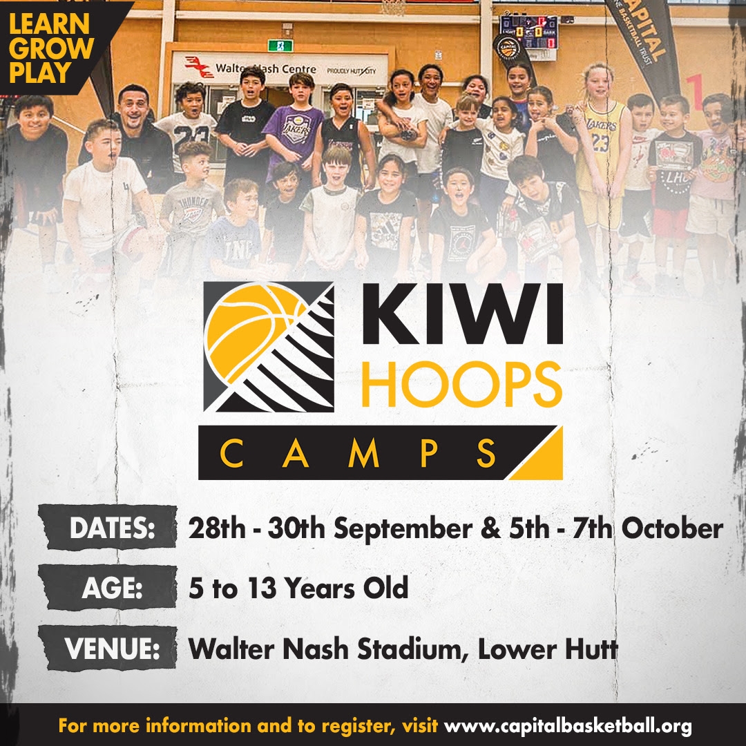 Kiwi Hoops Basketball Camps are back on these school holidays at Walter Nash Stadium in Lower Hutt. See the flyers below for more details.