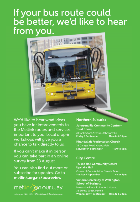 If you can’t make a local session, then you can give feedback through an online survey, just go to Metlink.org.nz/busreview from Friday 23 August onwards.