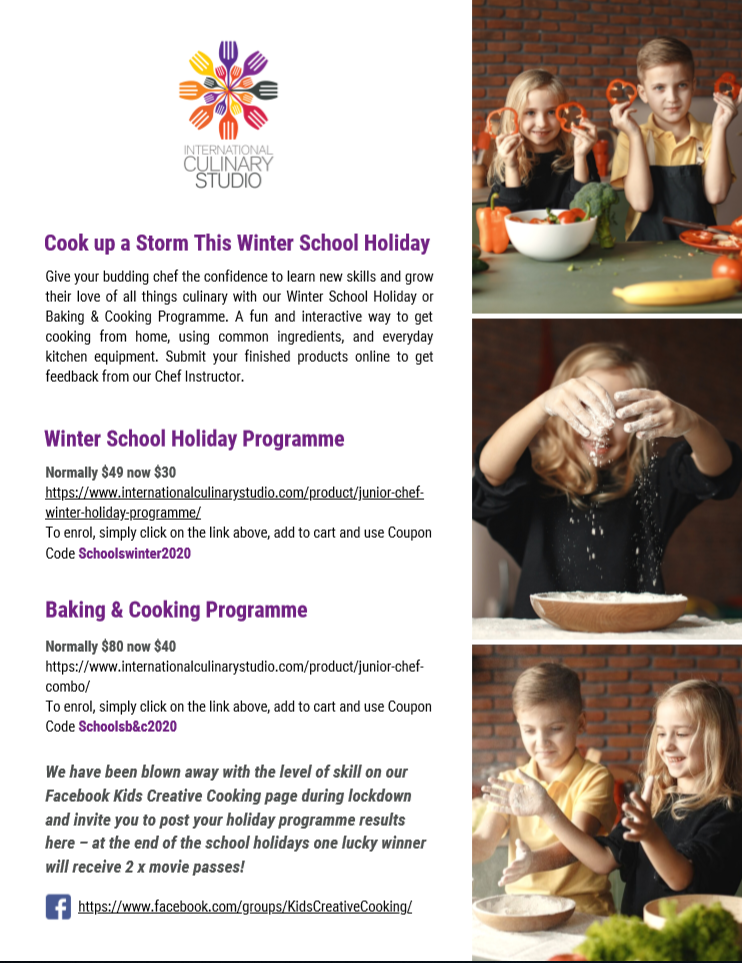 there is a great special price for the upcoming holidays of only $30 for the Winter School Holiday Programme and $40 for the Baking & Cooking Programme.
