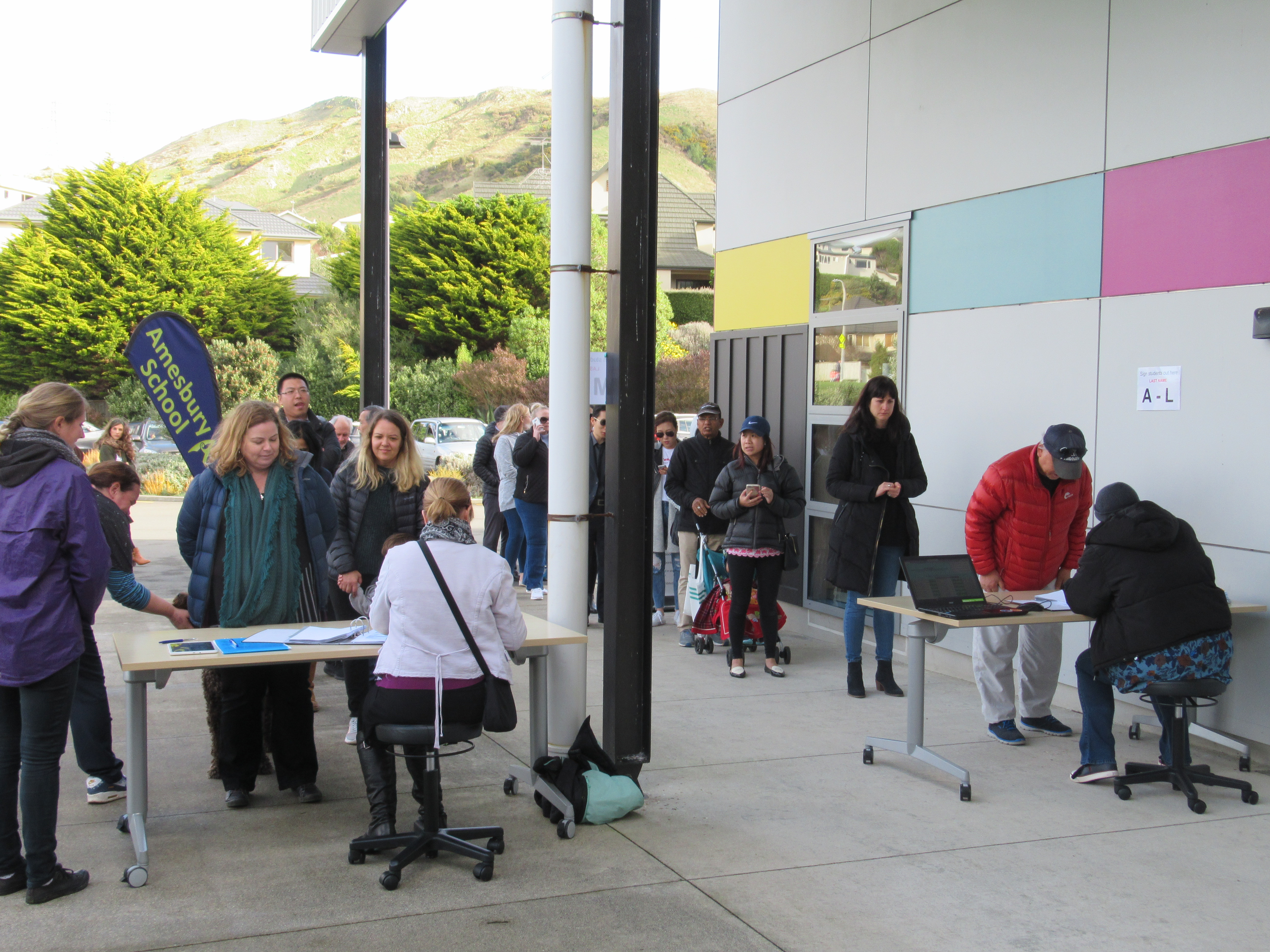 We deliberately keep parents and whānau separate from the children until the students have been formally signed over to an emergency contact. This is to ensure that students are only picked up by registered contacts. In the stress of a real emergency it is important we have clear protocols to follow that ensure all students are carefully monitored and that we fulfil our duty of care up until they are handed over to appropriate caregivers.