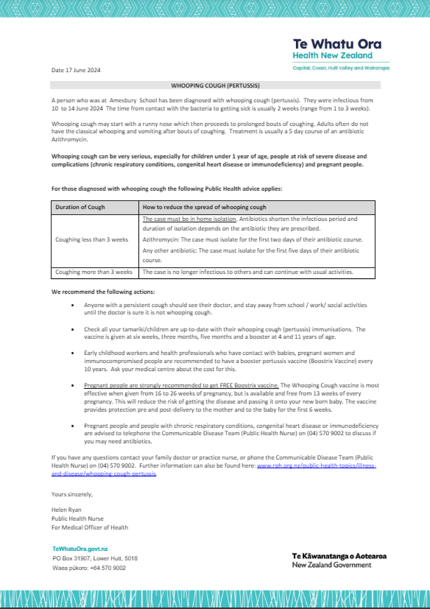 The Public Health Service have asked us to share this attached important information regarding a case of Whooping Cough (Pertussis), including what to look out for and recommended actions.
