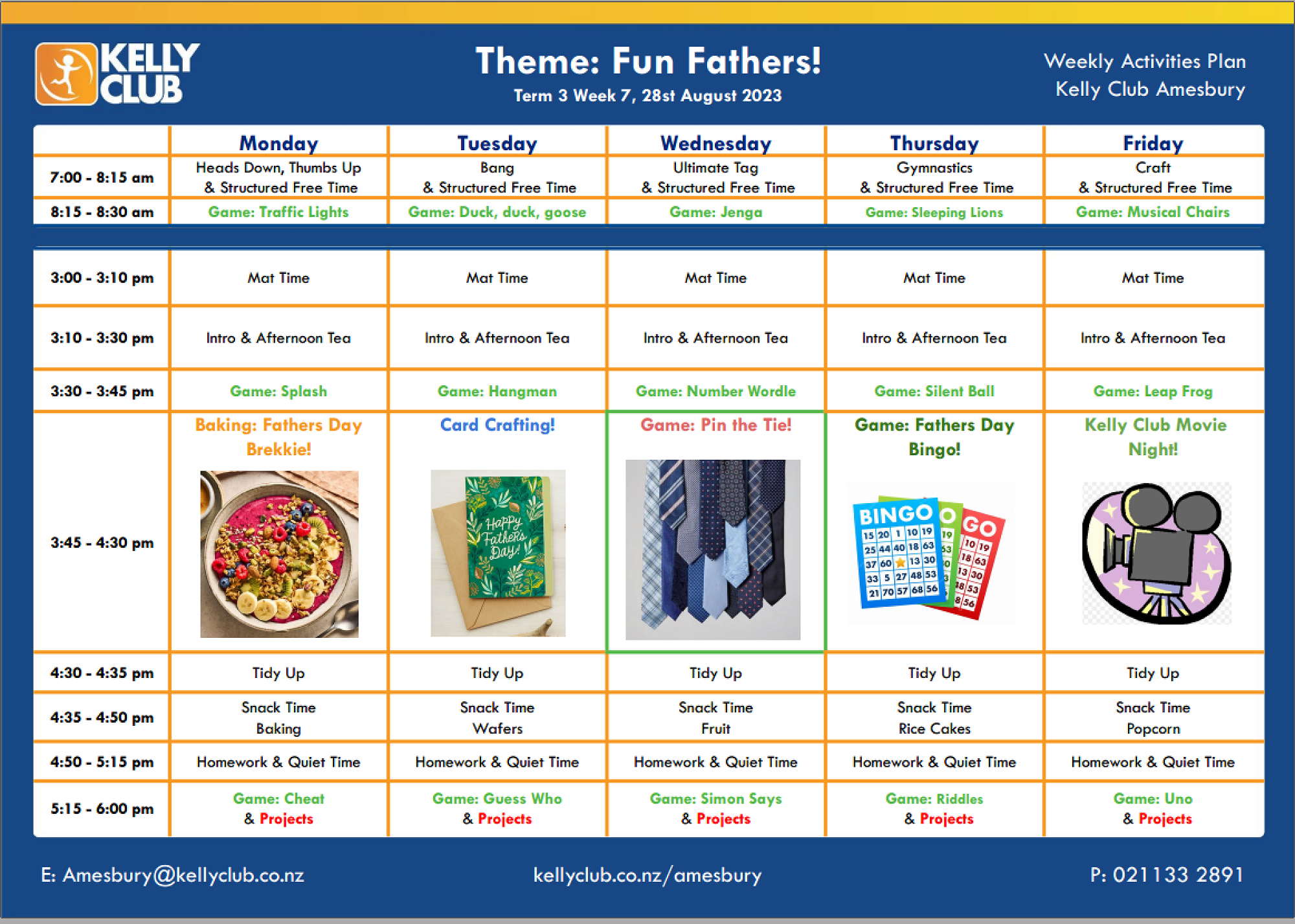 We will be kicking off the week by teaching the kids how to make a Fathers' Day Brekkie so they are all ready for Sunday morning! We will also be making crafty cards, playing some themed bingo and competing to pin the tie on the dad! The week will finish off with a well deserved movie night!