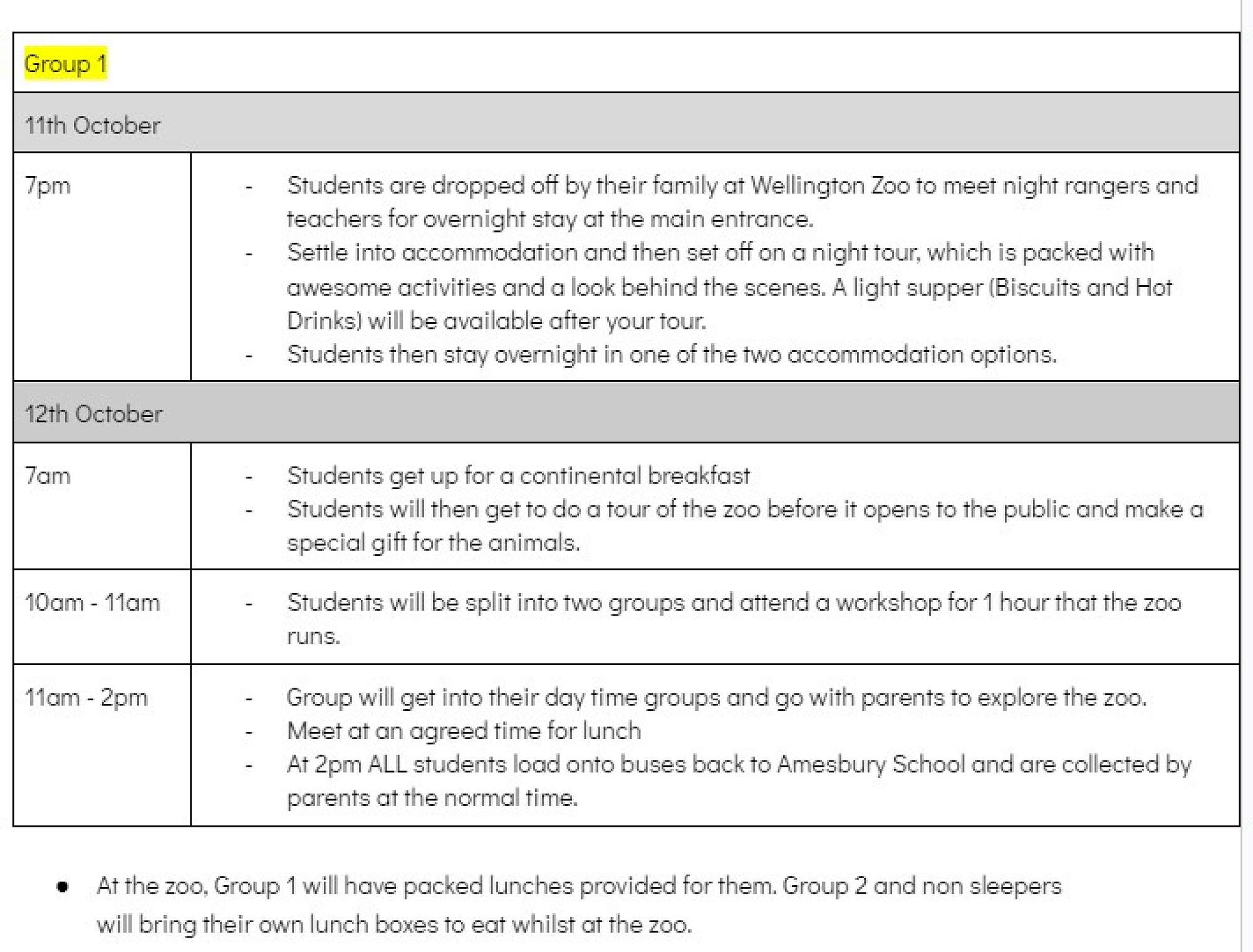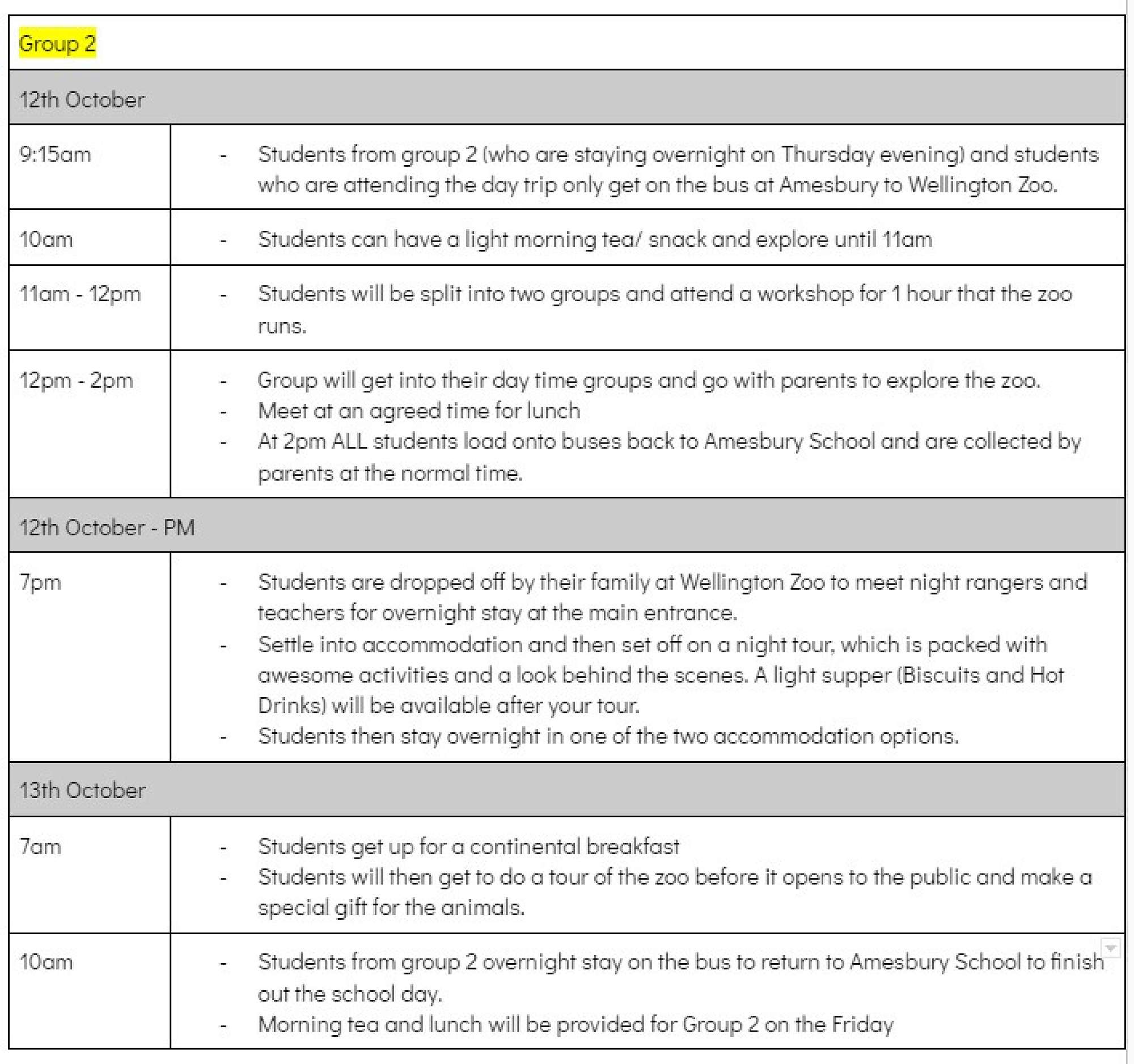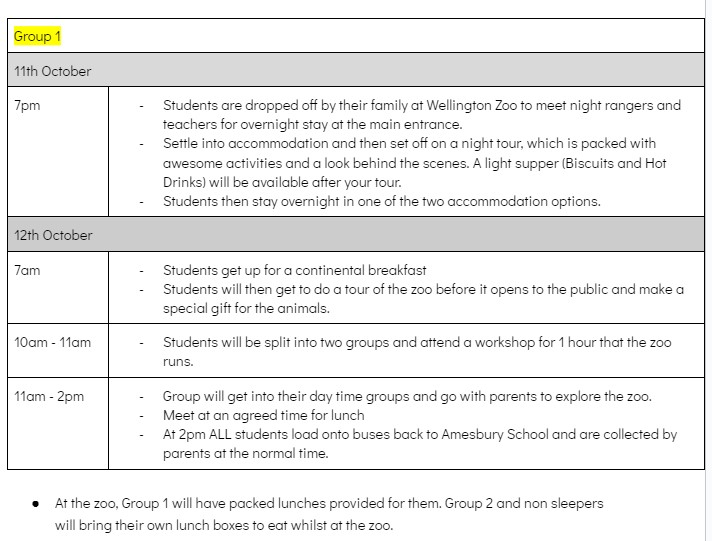 If your child is not staying overnight, they will still attend the day trip to Wellington Zoo on Thursday 12th October