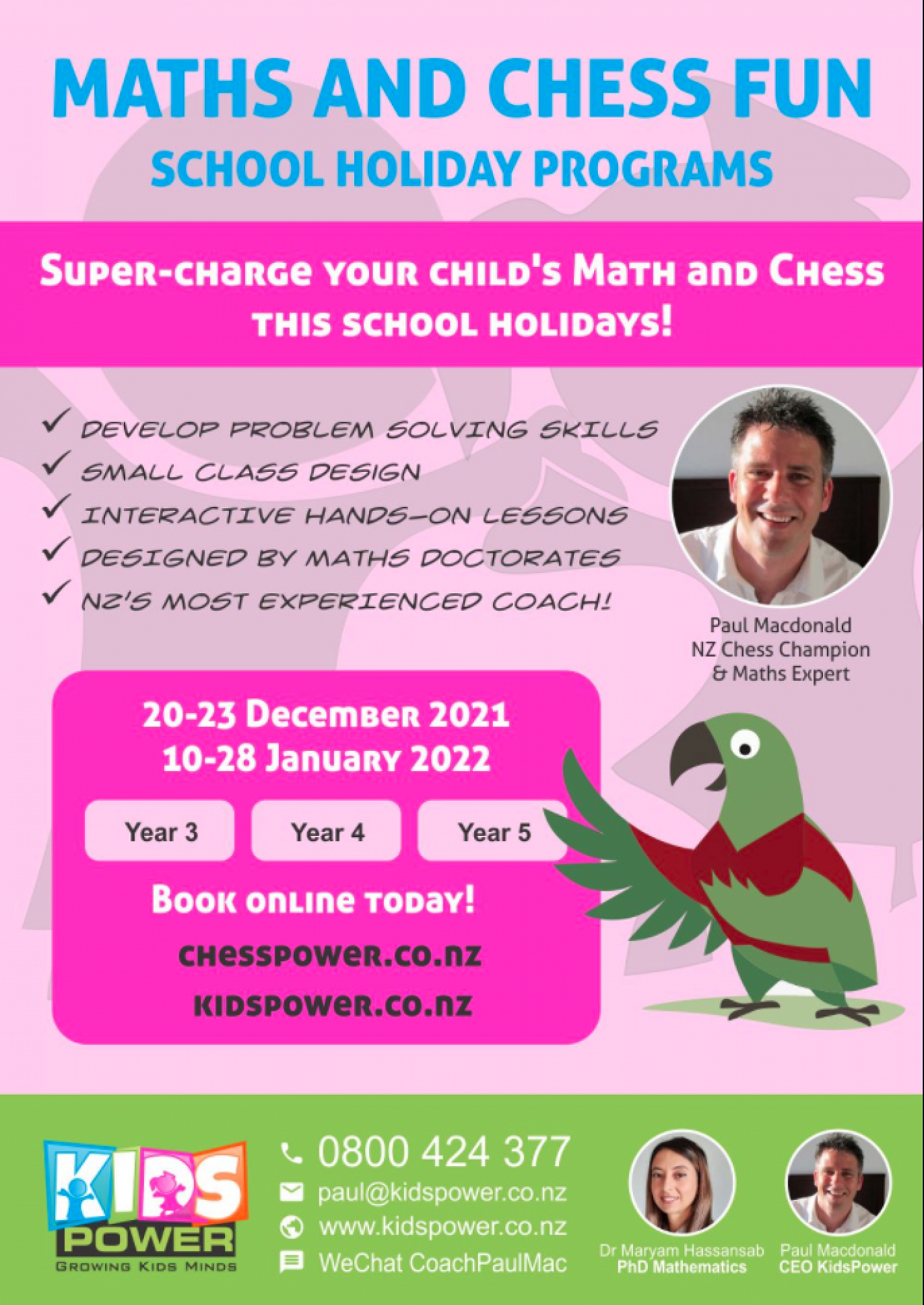 20th – 24th DEC 2021 and Jan 10th – Feb 4th 2022 from 7.00am-6pm daily. Interactive Activities and NO TV or Video Games, Kai Cubs Cooking, Keep Fit Karapu Fitness, and Life Skills Programme creating healthy Breakfast, Lunch and Afternoon Teas. One-on-one care and shuttle services available. Daily $81.04/cub per session or $137.77 for two siblings per session; Weekly: $324.16 per cub/week or $551.07 for two siblings/week. MSD Approved & WINZ subsidies are available for eligible families.
