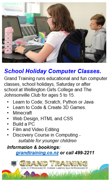 Grand Training runs educational and fun computer classes, school holidays, Saturday or after school at Wellington Girls College and The Johnsonville Club for ages 5 to 15.