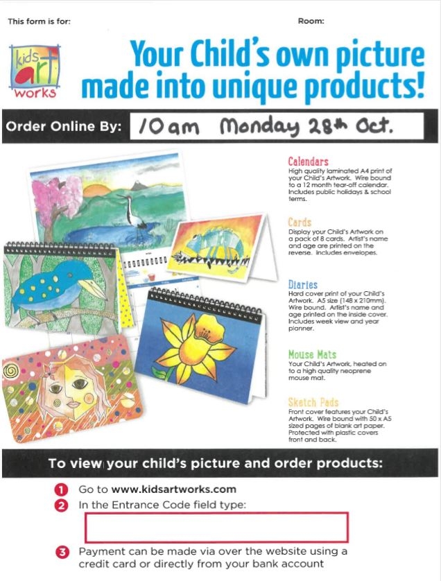 All orders are to be placed online via the KidsArtWorks website. Orders cannot be made via the school by cash or on the school account.