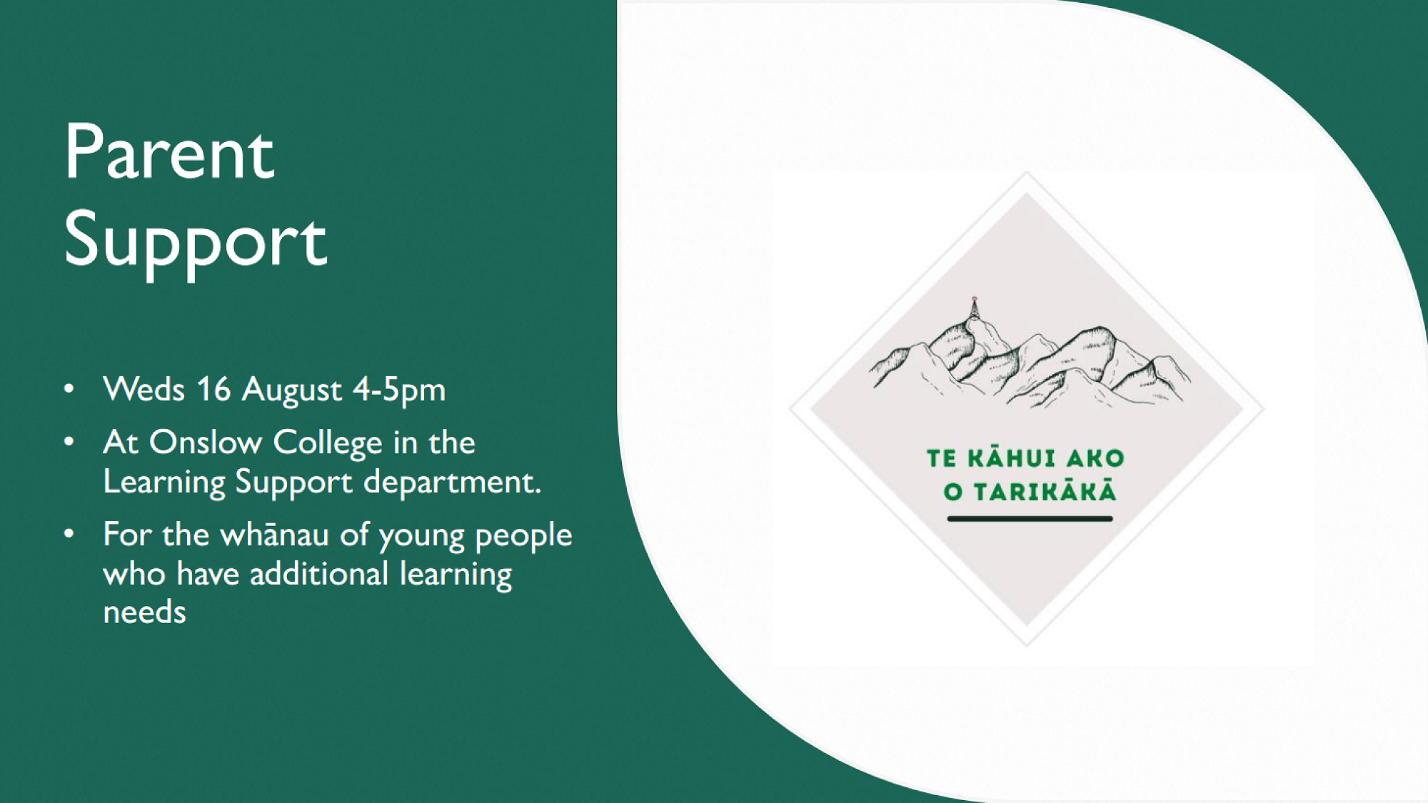 Onslow College are facilitating a Parent Support Event this Wednesday (16 August) in their Learning Support Department. The event is for the whānau of young people who have additional learning needs: