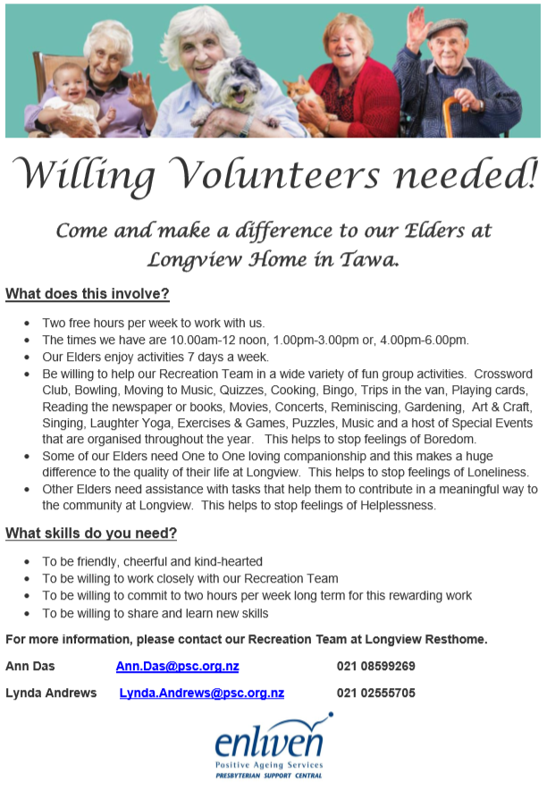 If you have a few hours spare and think that you would like to volunteer to help the elderly then the Longview Resthome in Tawa is interested in hearing from you.