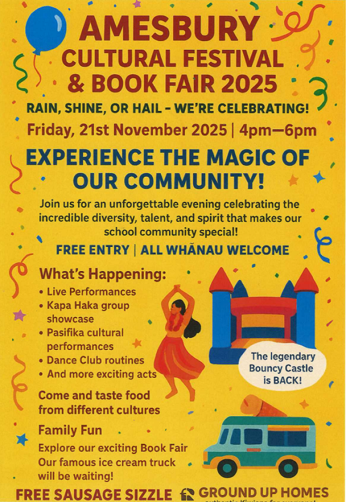 We also want you to share with the Amesbury community your cultural foods. So far we have Chickpea Curry with rice, Dumplings, and Palestinian Cake on offer. We are still looking for more contributions so, if you wish to contribute, please email Kirat at kirat@amesbury.school.nz.